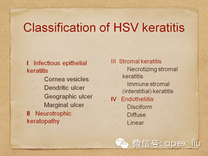 根据角膜累及部位目前国际上分为四种类型: 上皮型角膜炎、 神经营养性角膜溃疡、基质型角膜炎和内皮型角膜病变。
