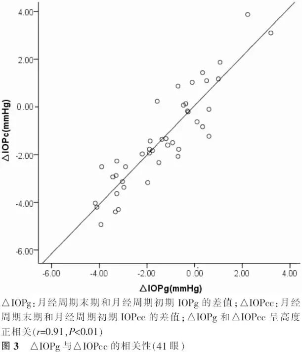 【摘要】 目的 探讨中国青年女性生理周期期间角膜生物力学性能和眼压的节律性变化以及两者之间的关系。方法 前瞻性研究。41例健康青年女性分别在月经周期初期、排卵期和月经周期末期用眼反应分析仪(ORA)对角膜补偿眼压(IOPcc)、可重复模拟Goldmman眼压(IOPg)、角膜滞后量(CH)和角膜阻力因子(CRF)进行测量。采用Pentacam对CCT进行测量。采用重复测量方差分析法分析测量参数在不同时间点的变化以及Pearson相关进行相关性分析。结果 在女性生理周期的不同阶段,CCT、CH和CRF存在波动,但差异无统计学意义,在月经周期末期IOPcc和IOPg均较初期显著下降(P<0.01)。△IOPg与△CRF呈低度正相关(r=0.356,P<0.05),与△CH呈低度负相关(r=-0.336,P<0.05),△IOPcc则与△CH呈中度负相关(r=-0.702,P<0.01),与△CRF不相关(r=-0.069,P>0.05)。△CRF、△CH、△IOPg和△IOPcc均与△CCT无明显相关性(│r│均<0.3,P均>0.05)。结论 在女性生理周期期间,角膜生物力学性能无明显变化但眼压在月经周期末期发生了显著下降。IOPg的变化与CH、CRF低度相关,而IOPcc则与CH中度相关,与CRF不相关。角膜生物力学性能可能是眼压的影响因素之一。