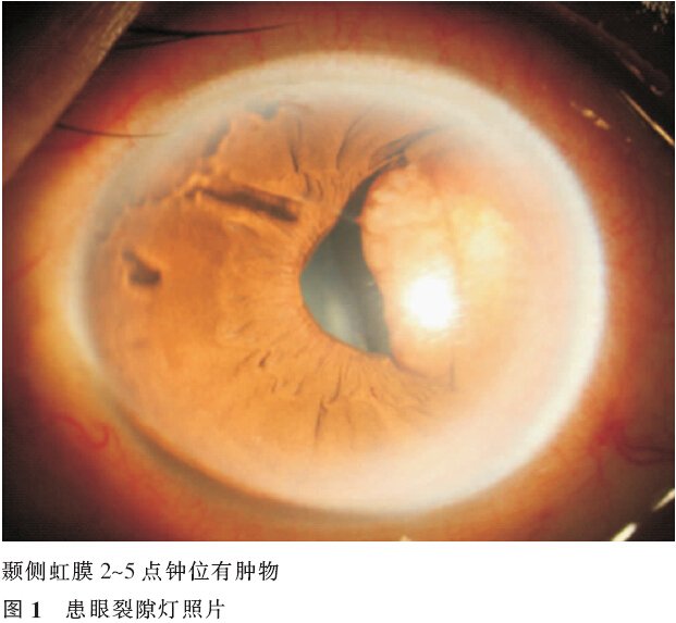 患者,男,60岁。2012年11月30日因左眼视力下降、头痛1个月入住我院。眼部检查:裸眼视力右眼1.0,左眼0.2;眼压右眼15 mmHg,左眼15 mmHg;右眼前段和眼底正常。左眼结膜不充血,角膜透明,前房深浅不等,颞上方前房变浅,相应区域虹膜肿物隆起,近瞳孔缘区可见囊性改变,瞳孔变形(见图1),超声生物显微镜检查示左眼虹膜肿物(见图2)。住院后行全身检查,胸片示右上肺占位性病变(肺癌);头颅MRI检查示左侧半卵圆中心占位性病变;胸部及上腹部CT示右上肺肿块,左肺多发性结节,纵隔内多发肿大淋巴结;经皮肺部穿刺后病理检查示:右肺低分化鳞状细胞癌伴灶性坏死(见图3)。