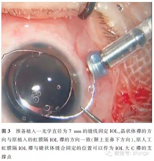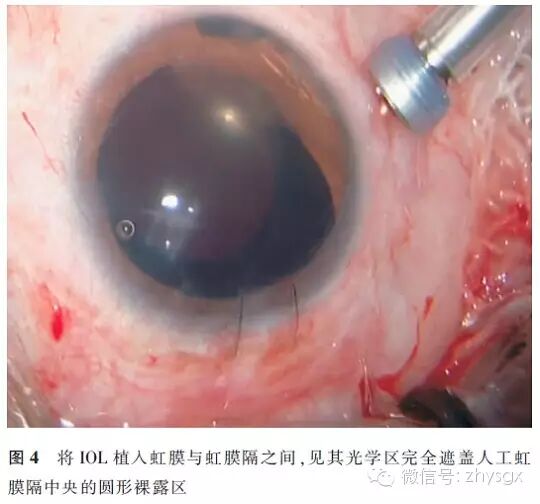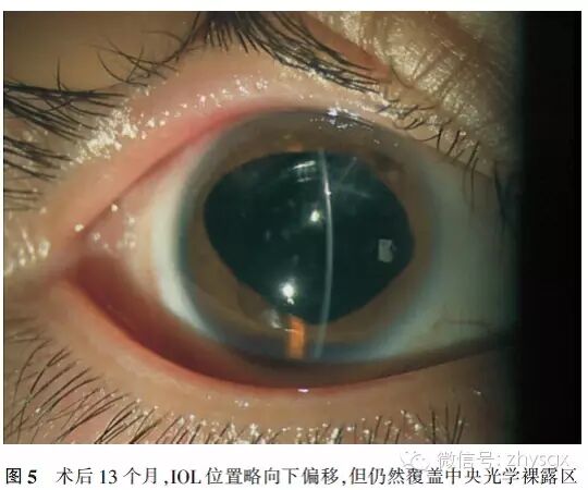 患儿,男,12岁,因“右眼被硬物碰伤后视力下降1个月”,于2011年6月20日就诊于我院眼科。追述病史:5年前曾因“右眼角膜穿通伤、前房异物、眼内炎”于本院依次行右眼角膜缝合、前房异物取出、外伤性白内障摘除、玻璃体切除、视网膜切开及硅油填充术联合环扎、硅油取出术联合剥膜及激光术,术后因瞳孔直径为9 mm,于2008年2月5日行带虹膜隔的IOL(德国目尔艳,型号:67G)缝线固定术,矫正视力恢复到0.4。眼科检查:右眼视力0.1,左眼1.0;右眼结膜无充血,鼻上方角膜有一局灶云翳(原角膜伤口),余角膜透明;前房清亮、深度正常;IOL光学区倾斜,见上方12点与下方6点处与人工虹膜边缘相连,其余部位均离开人工虹膜内缘,暴露其侧面的凹槽(见图1);右眼眼压11.6 mmHg,左眼14.3 mmHg;眼底检查见视网膜平复。左眼前后节无异常。2011年6月27日复诊诉右眼视力又下降,检查:视力:右眼0.02,左眼1.0,右眼下方角膜基质水肿,IOL光学区脱入前房与角膜内皮相贴(见图2),前房深度正常,眼压12 mmHg,眼底检查同前。角膜内皮镜检查:右眼角膜内皮层大量细胞形态不清晰、散在暗区,细胞密度:1979.1 cells/mm2。诊断:右眼IOL光学区脱位;右眼球钝挫伤;右眼虹膜隔IOL植入术后。在签署知情同意书后,我们于2011年7月5日采用23G经结膜、巩膜两步法穿刺置灌注维持眼压,作上方透明角膜切开,行IOL光学区取出,并在人工虹膜隔与虹膜之间植入一光学直径为7 mm的缝襻IOL(美国爱尔康,型号:CZ70BD),其襻的方向与原虹膜隔IOL襻的方向一致(颞上至鼻下方向)(见图3),其光学区覆盖人工虹膜中央的圆形裸露区(见图4)。术后第1天,角膜内皮轻度水肿,前房深浅正常,房水闪辉(+)。术后10 d检查:视力右眼0.12,左眼1.0,右眼结膜无充血,角膜透明,前房深浅正常、房水清亮。IOL位置向下偏移,但仍覆盖人工虹膜中央裸露区。2012年8月6日复诊,视力0.2,矫正视力0.25,角膜透明、前房清亮、深浅正常,IOL位置无变化(见图5),眼底检查视网膜平复,眼压正常。