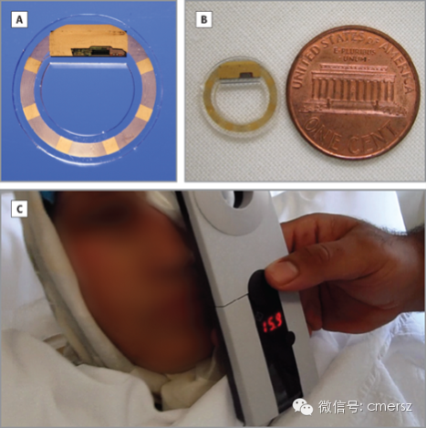 而有关24小时眼压监控的最新研究,将设备更进一步改良,发展出植入式无线眼压监控仪(Implanted Wireless Device For Monitoring Intraocular Pressure)。在病人接受白内障手术时,同时植入监控仪器(图2),仪器有特别的供电及数据存储装置,无需外接外界的任何设备,只需医生手持数据读取仪器在眼球前面进行扫描,即可获得眼压数据。而这一研究亦开始应用在病人身上,最新的数据发布在国际权威杂志上,短期研究结果显示所植入的仪器未有引起任何眼部副作用,医生亦能稳定地获得眼压度数。甚至有研究提出将微型感应晶片植入人工晶体内(图3),如此将更提高测量的质量。