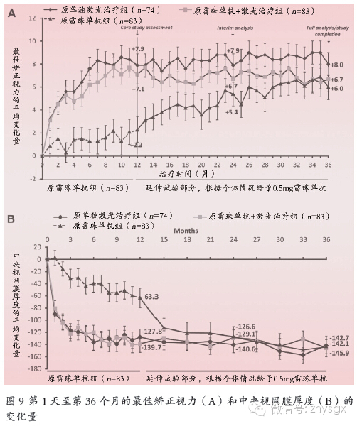 延伸试验第12个月至第36个月,所有患者均接受个体化剂量的雷珠单抗治疗,药物剂量根据预先设置的基于最佳矫正视力稳定性和疾病进展所需再次治疗的标准。具体方案为,所有患者于每月接受0.5mg雷珠单抗玻璃体腔内注射,直到视力稳定为止。视力稳定的标准为,某1个月时间点随访的视力与前2次随访相比,最佳矫正视力没有因治疗而得到提高,或者当最佳矫正视力≥84个字符(ETDRS视标,相当于Snellen视力表中20/20)。一旦检查者认为患者因DME而发生最佳矫正视力的下降,则每月给药的方案将被重新启动,直至视力再次稳定为止。