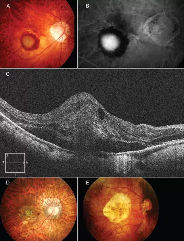 图 2 活动性近视性 CNV,A 为彩色眼底照相,B 为 FA,C 为 OCT 影像;D 则为纤维色素瘢痕(Fuchs’斑),E 为近视性 CNV 消退后的脉络膜视网膜萎缩。