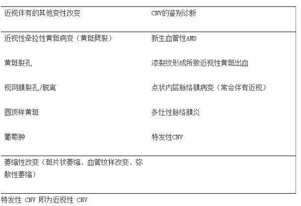 仅 OCT 无法鉴别视网膜出血病因为近视性 CNV 还是漆裂纹,漆裂纹所引起的视网膜出血无 CNV 者不需要行抗VEGF 治疗。此外,近视性 CNV 需要与多灶性脉络膜炎、点状内层脉络膜病变及年龄相关性黄斑变性(AMD)相鉴别。谨记,近视性 CNV 与 AMD-CNV 不同,特别是在年轻患者,近视性 CNV 主要为典型的 2 型 CNV,较AMD-CNV 小,视网膜下积液较少,发病时也常无玻璃膜疣。
