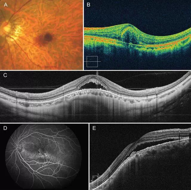 图 1 近视性 CNV 的鉴别诊断:A、B 漆样裂纹所致出血;C 为圆顶样黄斑伴浆液性视网膜脱离,D、E 为葡萄肿所致黄斑积液。