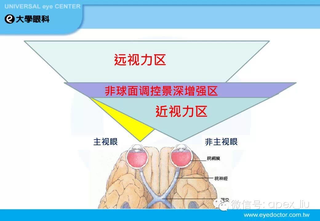 看远的是运用主视眼,看近的就是非主视眼的部分,而中间紫色区域就是运用非球面Q值调控景深,达到中距离视力的范围。