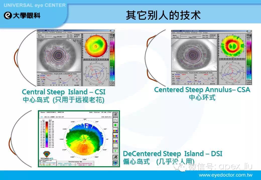 左上图就是一开始提到的多焦点角膜切削的设计,中间看近外围看远。