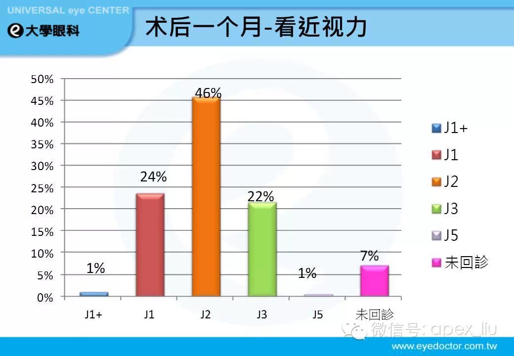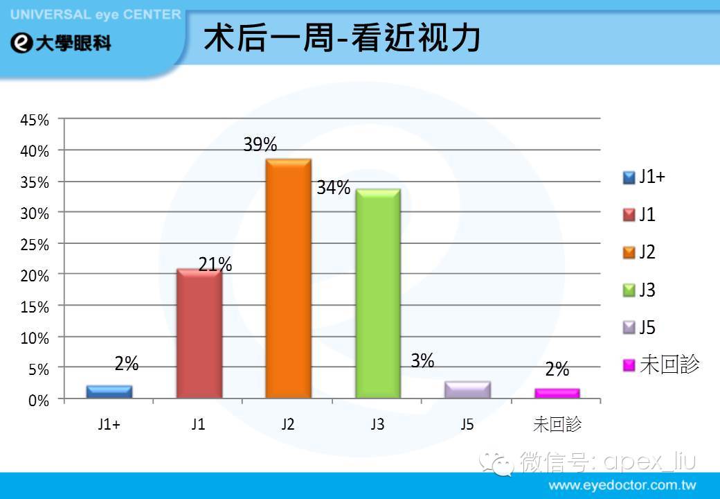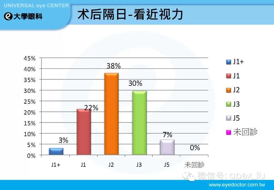 术后第一天能看到比J3还小的视标患者超出八成;J3就差不多是报纸或眼药水标签的字体大小,也就是说术后的隔日患者看报、看手机都不会出现问题!
