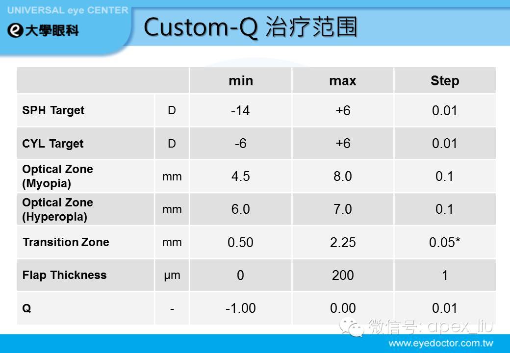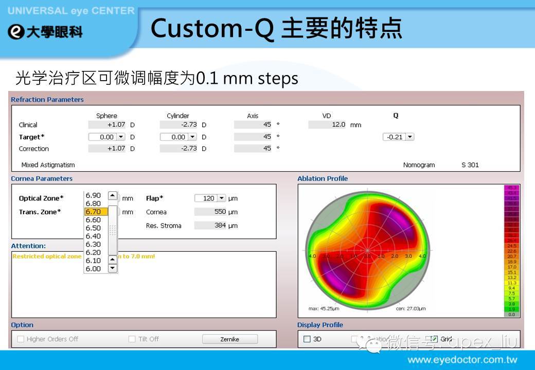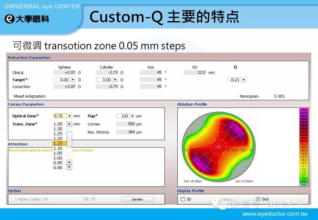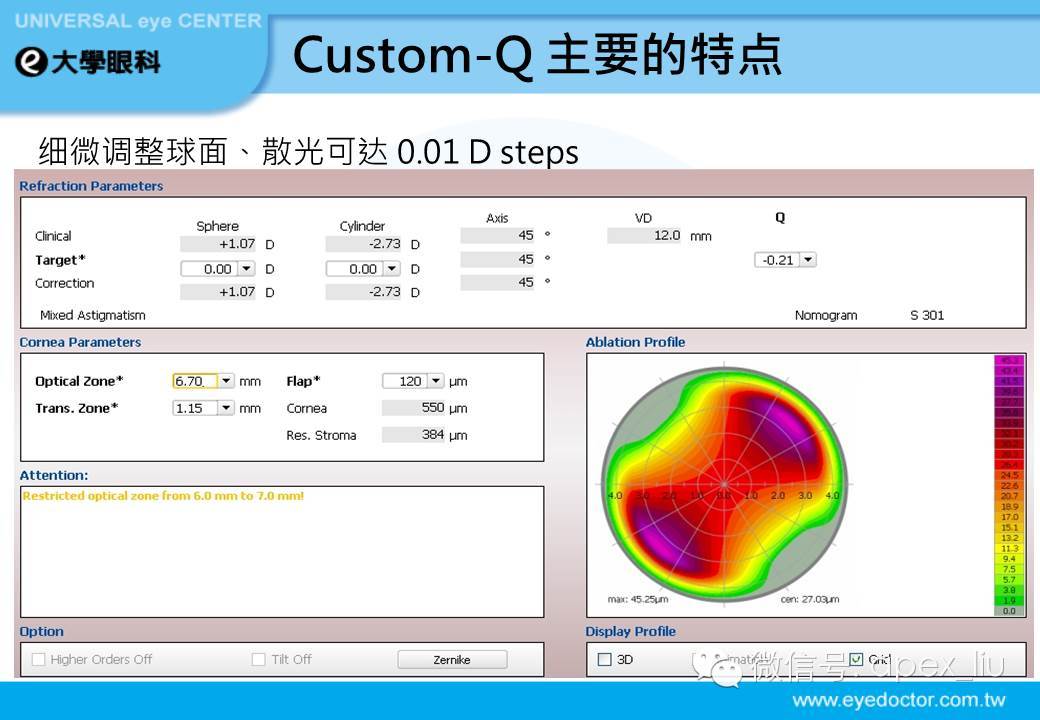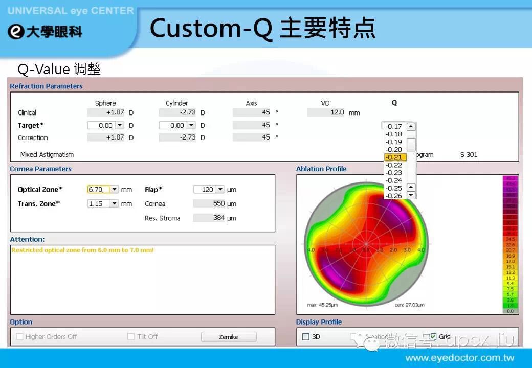 Q值调整的步骤和前导波优化的步骤不同,当我们进行前导波优化的治疗时,激光切削角膜会分成两个步骤,先矫正球面再矫正柱状散光。