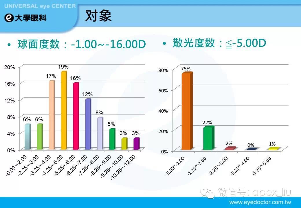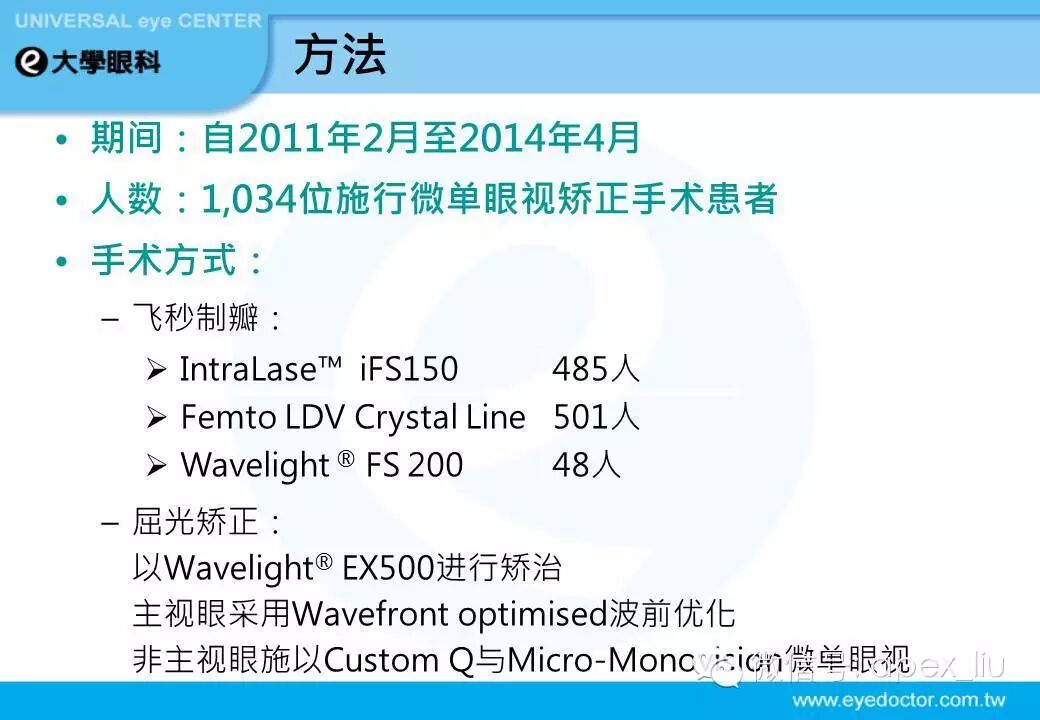 利用门诊随访视力表现统计,研究以飞秒激光(femtosecond laser)制瓣,并结合准分子激光(Excimer laser)进行个体化微单眼视(individualization micro-monovision)的屈光手术矫正的患者,手术后的视力表现。