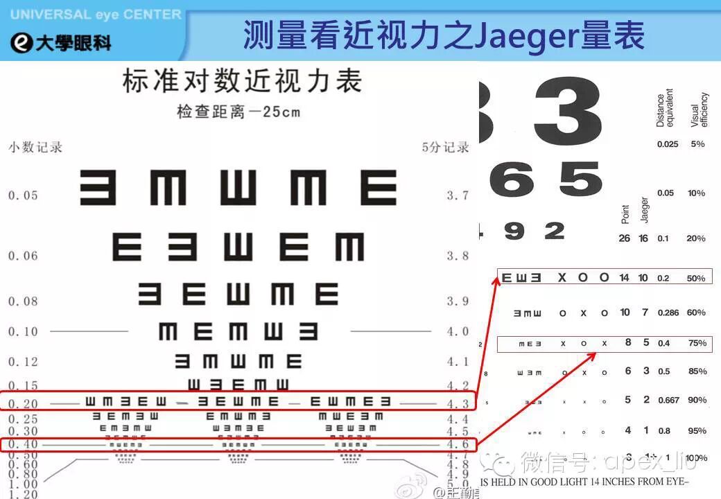 这是我们用来测试患者近视力的Jaeger量表, 和国内的标准对数近视力表比对J5的标准就和五分纪录4.6的大小标准是相似的。