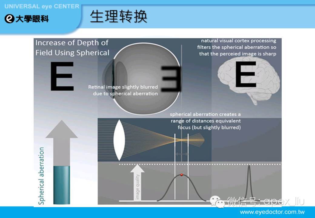 视网膜成像的质量是不只跟眼睛有影响和脑也是有关系的,虽然在图片里显示我们得到的是一个长散的焦距,在眼睛所显示的光学质量并不是那么好,不像像落在红点那么百分百清晰,但是有脑神经非常好的解释系统,只要该SA是可容忍的范围内,在经过脑的传导以及图形过滤锐化并保留了景深后,达到接近百分百的成像(右下波形高峰);就像图片左上方的E字虽然落在眼底时不是那么清晰(中间),但到达脑时就会变得非常清楚,这是一个非常重要的生理机制,这也是人类几千年来,生物几十万年以来,一个脑与视力演化的结果,是一个非常自然的现象。
