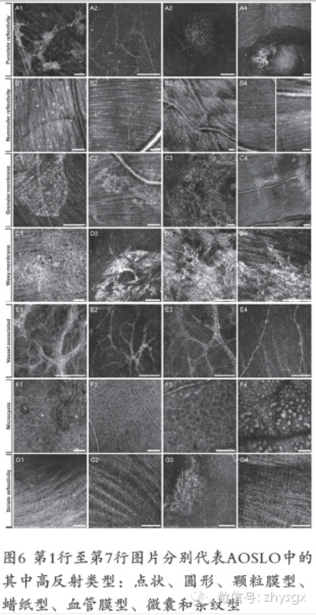 共112例患者发现有除了血管、视网膜神经纤维、中心凹反光外的AOSLO高反射现象,其中101例患有视网膜疾病或者神经系统疾病,11例无明显眼部疾病。基于大小、位置和质地,高反射现象被分为七种类型:点状、圆形、颗粒膜型、蜡纸型、血管膜型、微囊和条纹型。点状和圆形高反射均存在于患眼和健康人眼,而其余5类只发现于患视网膜疾病或神经系统疾病眼,其中部分类型高反射随时间发生轻微的改变。