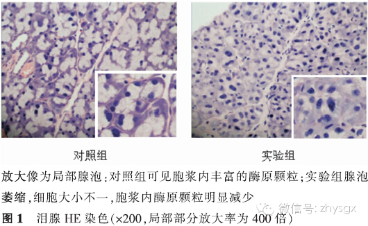 【摘要】 目的 建立去卵巢大鼠模型,观察性激素水平改变对泪腺中IL-17A以及IL-1β、IL-6、TNF-α等炎症因子表达的影响。方法 实验研究。健康雌性SD大鼠20只随机分为2组,实验组(10只)摘除大鼠双侧卵巢,对照组(10只)为未摘除卵巢的模拟手术组。术前及术后第1个月、第2个月、第3个月时2组均行泪液分泌试验(SIT)、角膜荧光染色检查进行眼表评估。于第3个月时放射免疫分析法分别检测2组大鼠血清雌二醇、睾酮含量,HE染色观察泪腺上皮细胞形态,免疫组化染色法、Western Blot法检测2组泪腺中IL-17A、IL-1β、IL-6、TNF-α的表达。2组性激素质量浓度比较、炎症因子A值表达比较均应用独立样本t检验。2组各时间点的SIT结果比较采用重复测量资料两因素方差分析。结果 实验组大鼠去卵巢后第3个月时,体内雌二醇浓度低于对照组(t=-35.37,P<0.01),睾酮浓度低于对照组(t=-12.13,P<0.01)。2组各时期SIT检查未见泪液分泌减少、均未见角膜荧光染色。HE染色见实验组泪腺腺泡萎缩,排列紊乱,胞质内酶原颗粒明显减少。泪腺IL-17A表达量2组比较实验组高于对照组(免疫组化法:t=7.56,P<0.01;Western Blot法:t=20.90,P<0.01)。余各因子表达量实验组也均高于对照组(免疫组化法:IL-1β:t=13.71,P<0.01;IL-6:t=13.92,P<0.01;TNF-α:t=6.11,P<0.01。Western Blot法:IL-1β:t=16.93,P<0.01;IL-6:t=12.46,P<0.01;TNF-α:t=14.47,P<0.01)。结论 大鼠去卵巢3个月时性激素水平降低,未见明显眼表损害。但泪腺中炎症因子IL-17A、IL-1β、IL-6、TNF-α的表达增加。