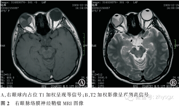 眼内神经鞘瘤的临床表现无特异性,易误诊为黑色素瘤。有文献指出MRI可能能帮助我们鉴别葡萄膜神经鞘瘤与黑色素瘤[4-5]。黑色素瘤的MRI特点为:在T1加权影像呈现高信号,T2加权影像呈现低信号。葡萄膜神经鞘瘤则不同,相对脑组织而言,神经鞘瘤在T1加权影像呈现等信号,T2加权影像呈现等信号或高信号。因此,MRI表现为位于葡萄膜的孤立性、边界清楚的占位性病变,其相对脑组织T1加权影像呈现等信号,又伴随视网膜脱离时,临床医生要注意神经鞘瘤的可能。