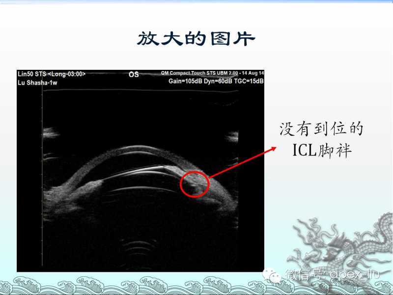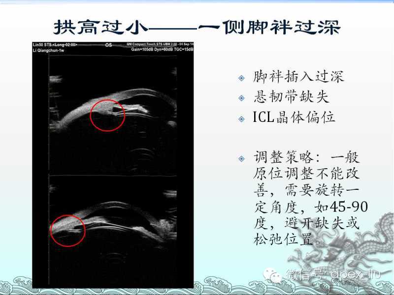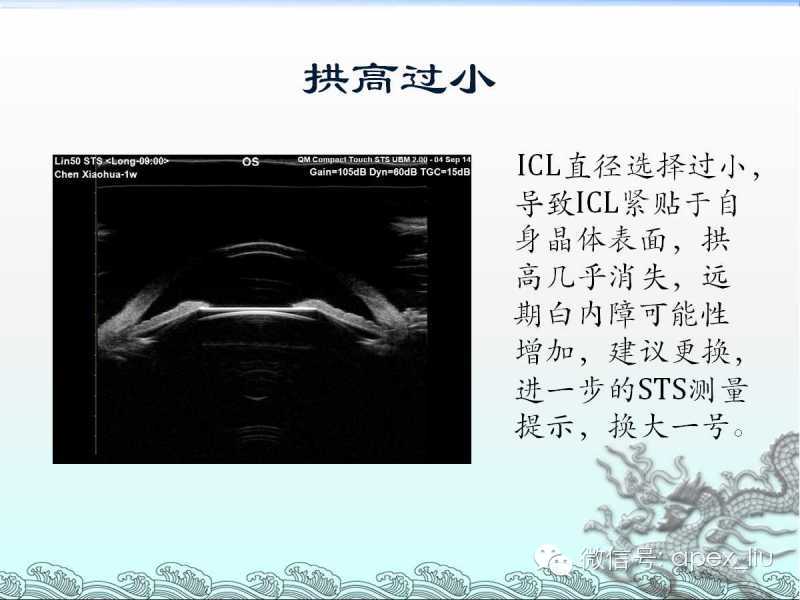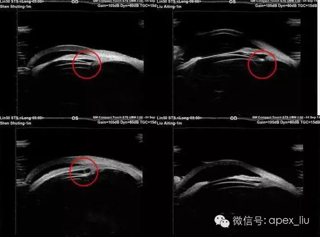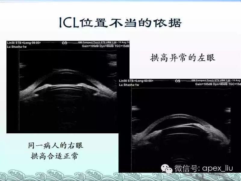 另一个例子是术后拱高小,几乎贴着自身晶体,手术医生也觉得是ICL选小了,于是就更换了大一号的,但比较糟糕的是更换后拱高几乎没有变化,仍然非常小,贴着自身晶体。如何办才好? 其实这样的例子在国际会议上也讨论过。 面对异常情况,在做进一步的处理前,一定要慎重,UBM作为辅助诊断手段,提供更多信息有助于合理选择手术方式