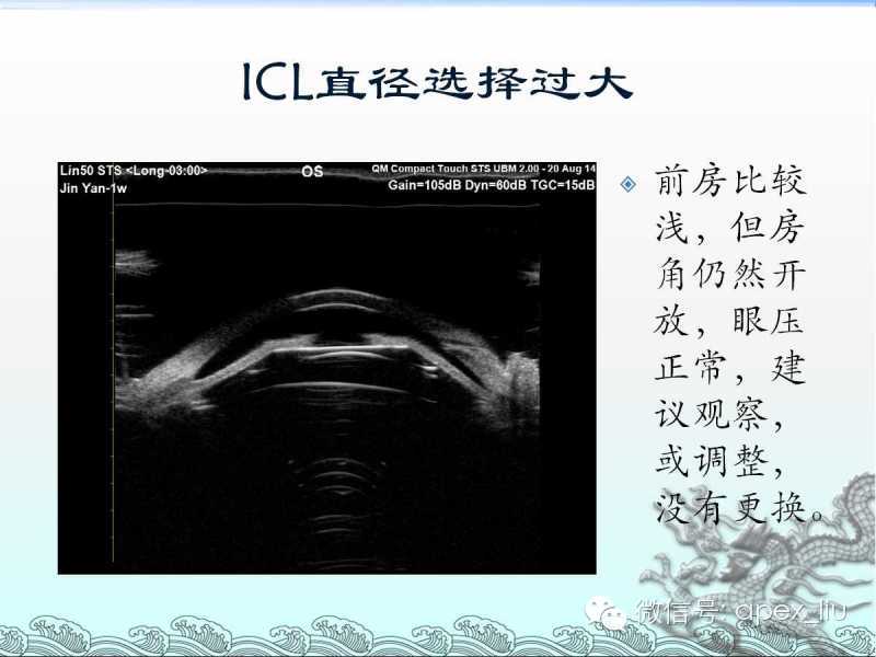 这里我想起2个会诊的病例,一个是拱高过大,术后眼压高,前房浅,手术医生因为是初做,比较纠结,过了几天换了一个小一号的晶体, 但是仍然前房浅,拱高大,后来我去看病人及资料,发现医生忽略了角膜厚度,以为前房深度3.31(而实际前房只有2.73 左右),WTW是11.5-11.7左右,第一次装的是12.5 第二次换了120,其实这么浅的前房本身就低于了正常要求(2.80),一般不考虑首选ICL,如果考虑也选最小号的11.5(当然有可能拱高偏低),最后患者是取出了晶体。在取出前我建议作个UBM看看,发现晶体几个脚袢都没能达到睫状沟,仍表现为偏大,并且有多处小囊肿,这些因素导致手术失败的主要原因,其实第二次更换前,如果做一下UBM,评估一下,而不是简单地更换,可以避免第三次手术。