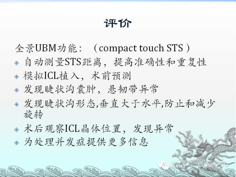再啰嗦几句:总之,在ICL人工晶状体植入术前应用UBM,可以定量和定性了解睫状沟的形态、预测ICL人工晶状体的位置及其与自身晶状体的关系,为术前手术设计和方案提供更多参考;在术后应用UBM,可以为术后出现异常提供诊断根据,并且为并发症的处理提供解决方案,对于提高该手术的成功率、减少并发症,具有重要作用。但是,由于UBM 检查为接触式,并且操作受到检查者的经验、手法等因素影响,尤其是定量的参数测量,目前,其稳定性和可靠性还不足以取代角膜水平横径(white to white ,WTW)作为依据来选择ICL晶状体大小,只能作为WTW依据的另一个参考。专门为ICL植入术设计的compact touch STS超声生物显微镜(Quantel Medical,France)在简化操作,方便准确采集图像等方面做了改进,使操作者更易于得到较为稳定和可靠的定量数据,是其最大的优点。另外一个特殊功能,即ICL模拟功能和预测拱高对术前选择ICL人工晶状体大小具有一定的参考价值,但由于其进入临床应用时间尚短,在预测拱高的准确性方面和实际值尚有一定差距,需要更进一步的临床实践、验证和改进。