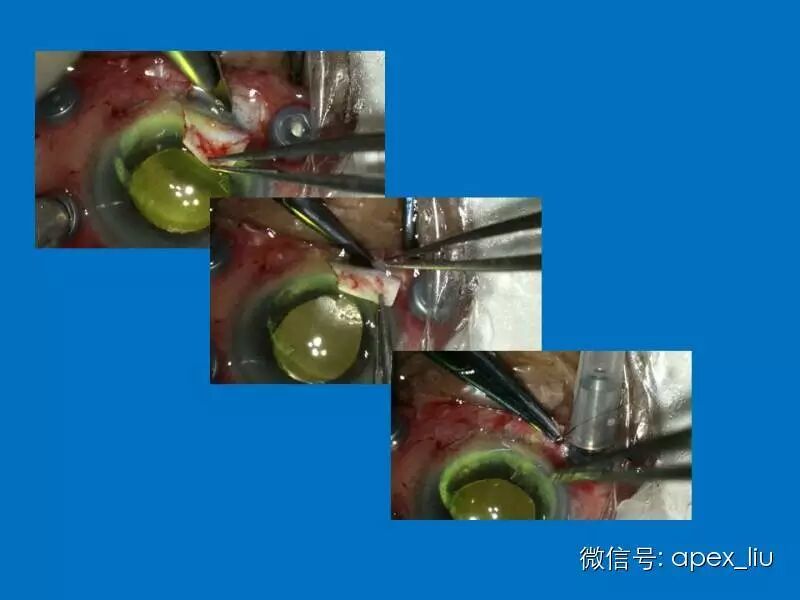在做玻切三通道前先做结膜瓣、巩膜瓣,这组患者的结膜瓣是以穹窿为基底的(也可以以角膜缘为基底,这是习惯问题),巩膜瓣上下方均可,之所以做在下方是手术前初步判断有可能术后注气或注硅油,不做在上方是为了防止气体或硅油阻塞滤过泡。然后用0.04%丝裂霉素放置在巩膜瓣下4-5分钟,再用平衡盐充分冲洗(我一般习惯冲半瓶平衡液,至少100ml),之后做23G三通道玻切,睫状体平坦部放置吊顶灯,切除混浊的玻璃体,做PRP,所有的这些步骤完成后做小梁切除后虹膜周切,复位巩膜瓣、缝合球结膜。