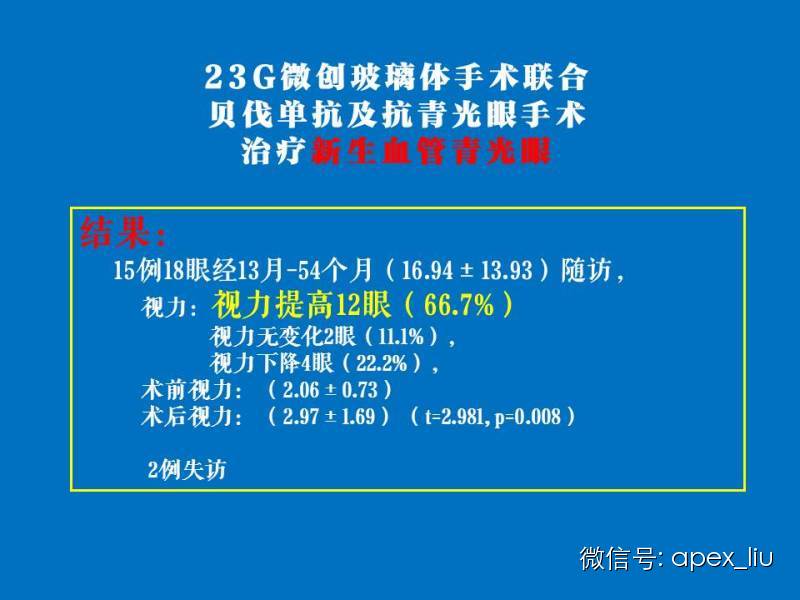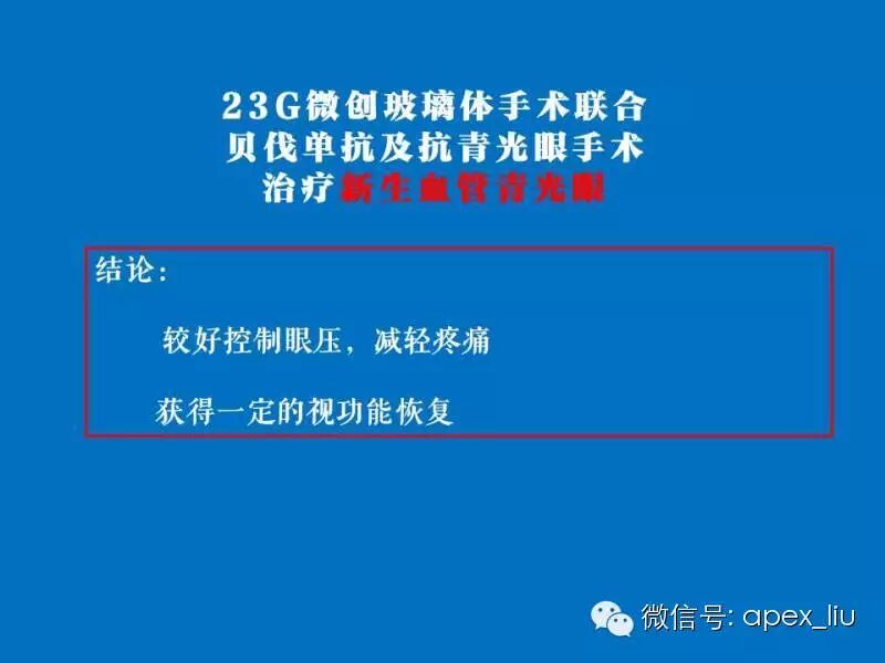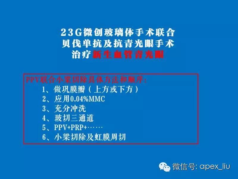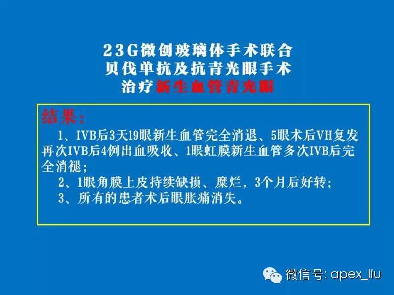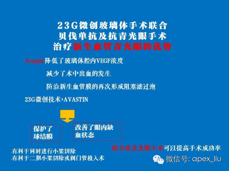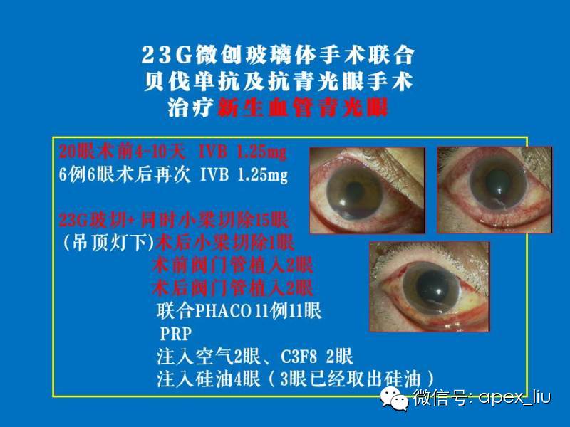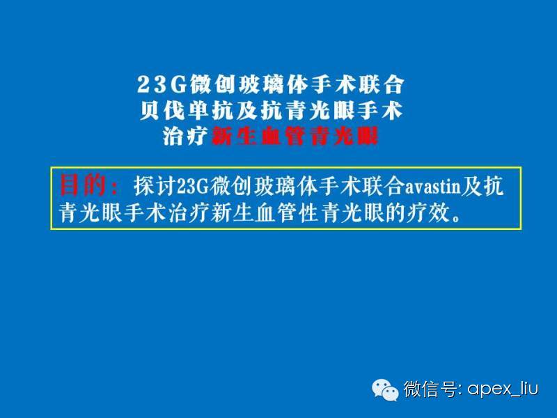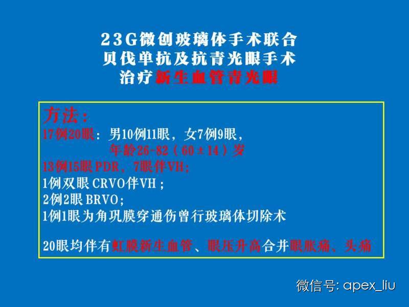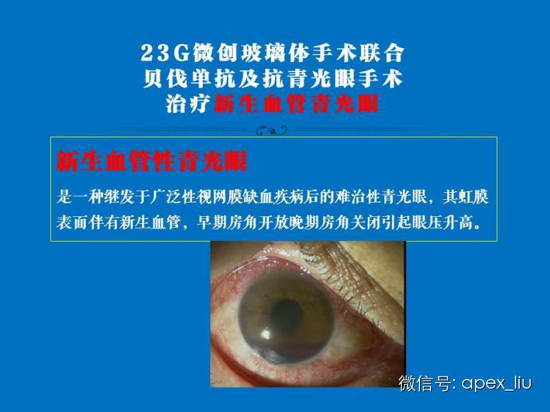 今天,我和大家交流的题目是“23G微创玻璃体手术联合贝伐单抗及抗青光眼手术治疗新生血管青光眼”,这也是今年我参加全国眼科年会发言的内容。