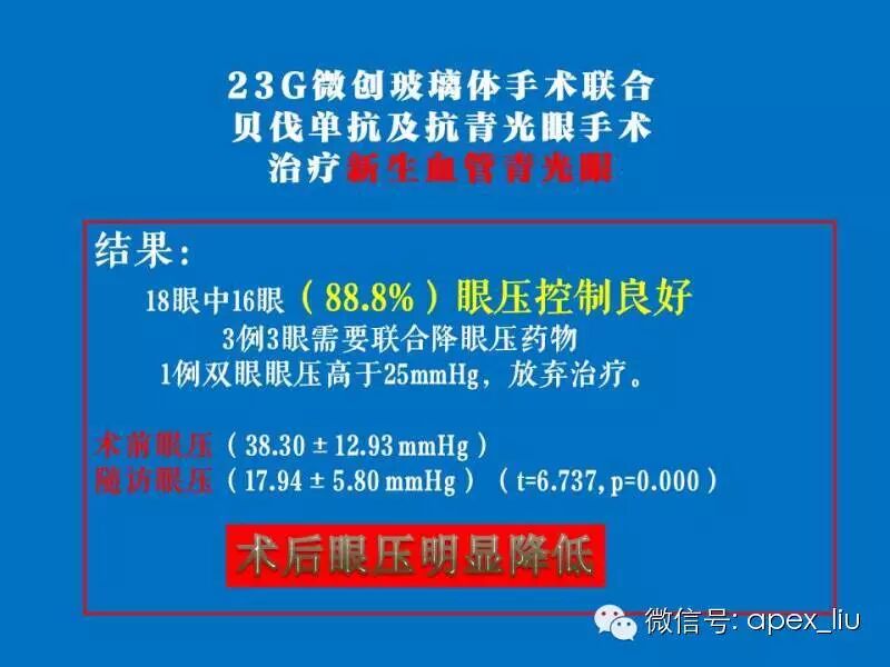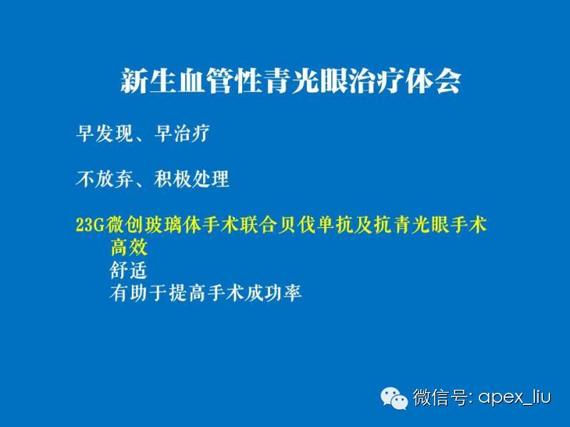 有关新生血管青光眼的治疗我的体会是:早发现、早治疗,不放弃、积极处理,微创玻璃体手术联合贝伐单抗及抗青光眼手术高效、患者舒适、有助于提高手术成功率。