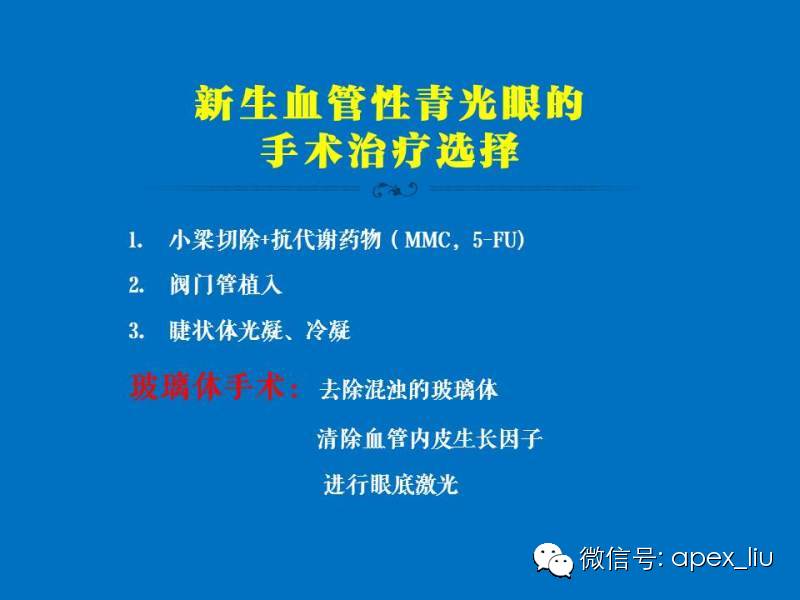 一旦发生了新生血管青光眼,用药物非常难控制眼压,患者十分痛苦。手术治疗有1、小梁切除联合抗代谢药物(包括术中应用丝裂霉素C,术后结膜下注射5-FU),优点无须特殊的耗材,花费比较便宜,缺点是手术成功率有限;2、阀门管植入术,优点是手术简单,缺点是阀门管花费较高;以上两种手术因为术后容易发生出血、增殖而使手术失败;3、睫状体光凝和冷凝,均为破坏性手术,如果光凝或冷凝的量掌握不好,可能效果不好或者发生低眼压,冷凝手术中患者不适,术后反应重,患者比较痛苦,这两种破坏性手术仅仅适用于已经丧失功能的眼球,目的仅仅是解除患者的痛苦。
