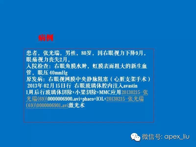 程:李院长,Sturge-Weber综合征的青光眼新生血管的形成机制与以上病人有点不同、不知道是否可以用上述方法治疗?您能否谈谈这方面的经验!谢谢!