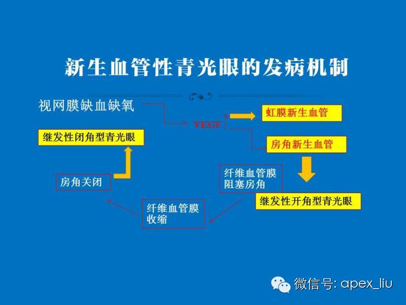 新生血管青光眼的发生机制已经非常清楚了:由于视网膜缺血缺氧,玻璃体腔内VEGF浓度升高导致虹膜、房角新生血管形成,最终引起早期继发开角、晚期继发闭角型青光眼。