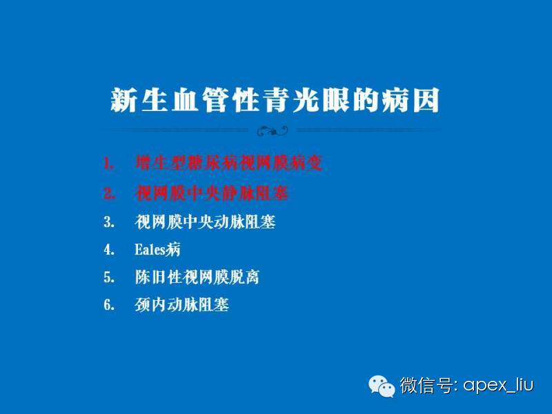 新生血管青光眼的病因有很多,其中最常见的是增生型糖尿病视网膜病变和视网膜中央静脉阻塞