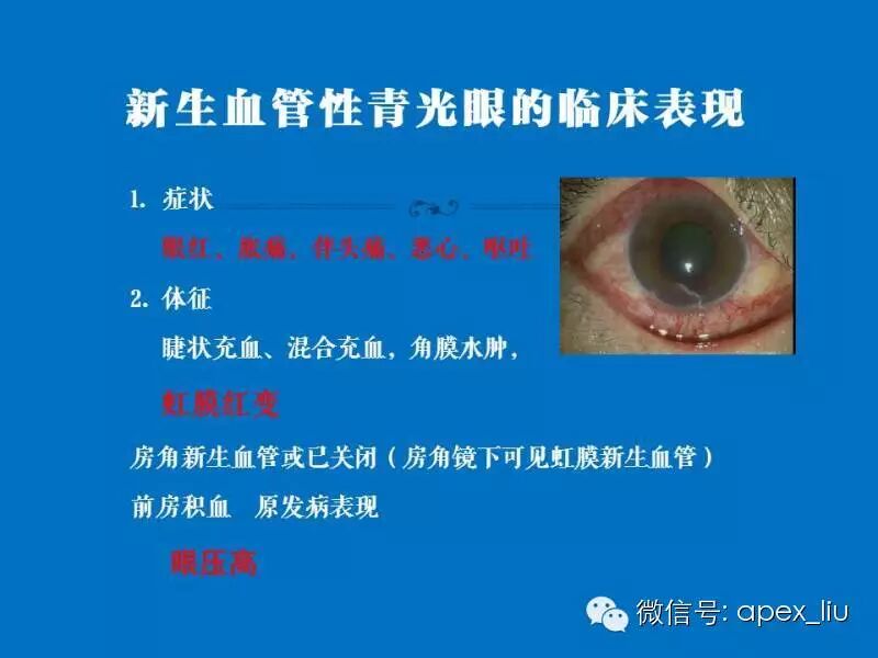 最初虹膜新生血管出现在瞳孔缘和房角,用前房角镜仔细检查房角可以发现红色的新生血管,这时房角是开放的,新生血管阻塞房角导致开角型青光眼;随着病情的进展,新生血管产生的纤维血管膜收缩,就好像拉拉链一样将房角关闭,这时就发生了闭角型青光眼。