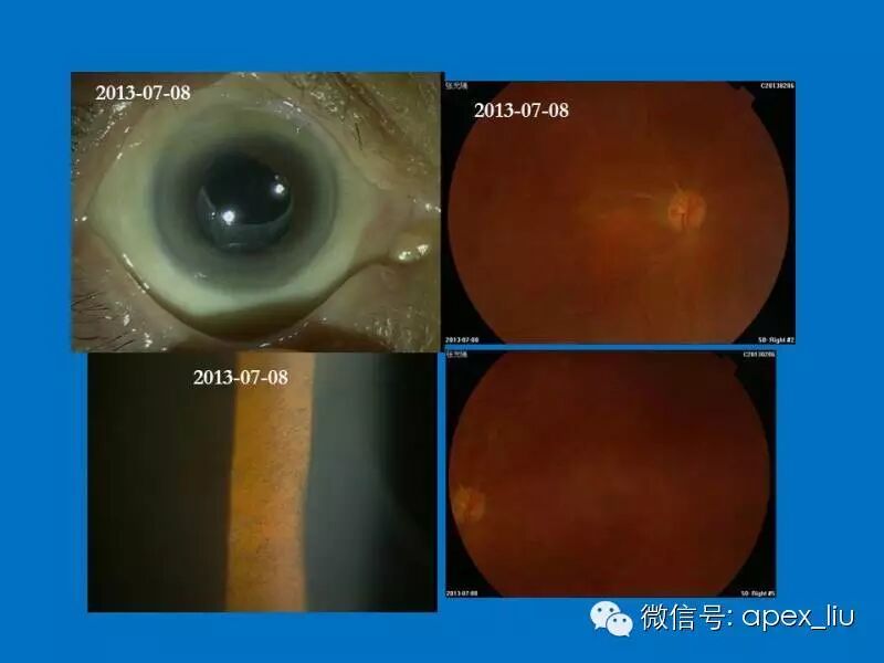 手术后5个月,随访,患者视力手动,无疼痛,角膜透明、虹膜无新生血管,视网膜广泛激光光斑,2014年9月随访,无变化。眼压15mmHg(双眼)。