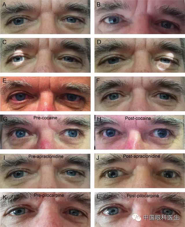 患者因为进行皮肤移植而入院,在出现右侧发汗发作时对患者进行药物学测试。10% 可卡因眼药水会导致双侧瞳孔扩大(图 1G、H),而 1% 阿可乐定眼药水导致较小一侧的瞳孔强烈收缩,0.125% 毛果芸香碱眼药水并没有使扩张的瞳孔缩小。