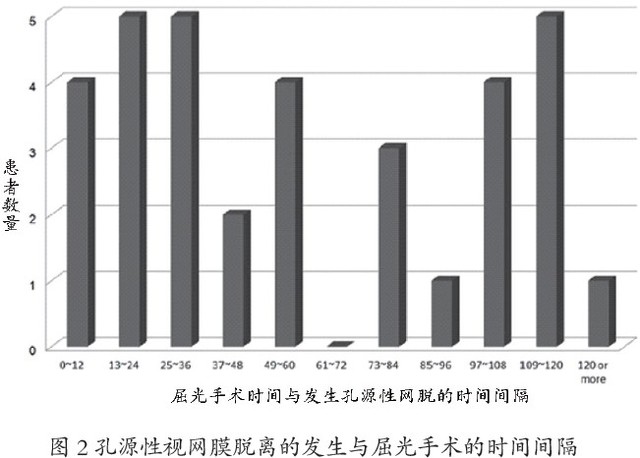 该研究共有106例106眼孔源性视网膜脱离患者,分别为21 眼LASIK 术后孔源性网脱,13眼LASEK 术后孔源性网脱,72眼屈光度低于-3.0D 的近视患者作为无手术对照组。孔源性视网膜脱离的特点包括视网膜脱离分布和相关的视网膜裂孔、裂孔的数量和分布,晶格退化的存在和眼轴长度。