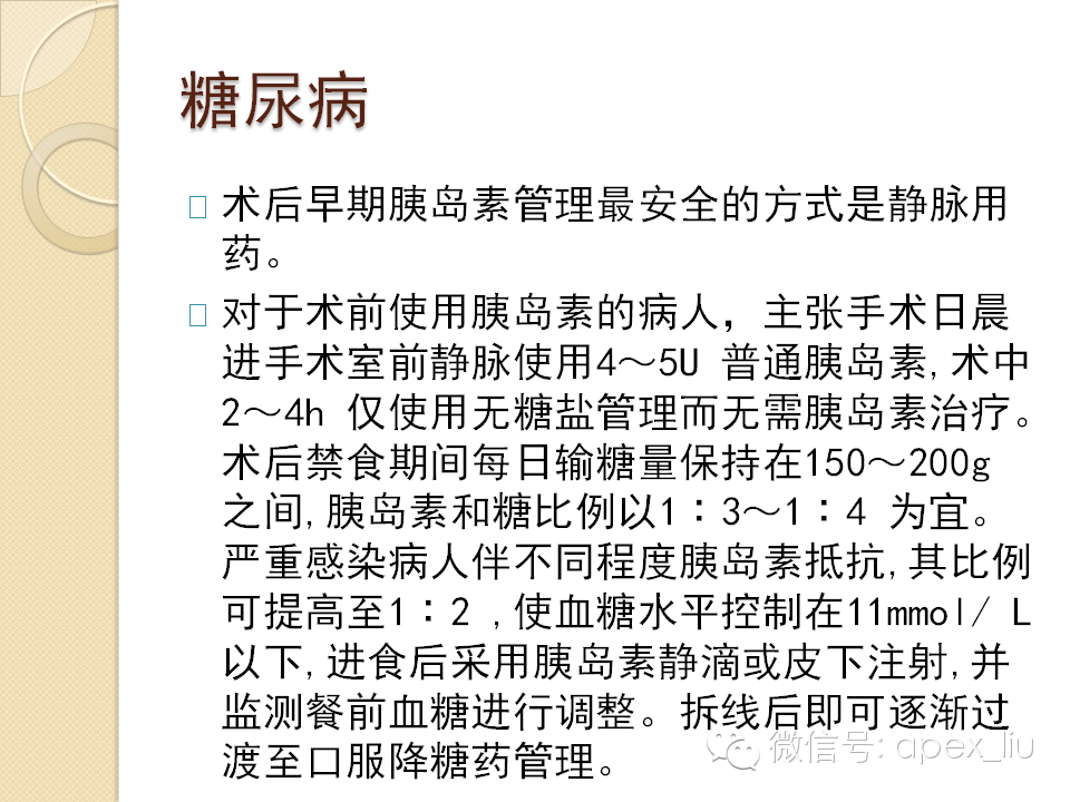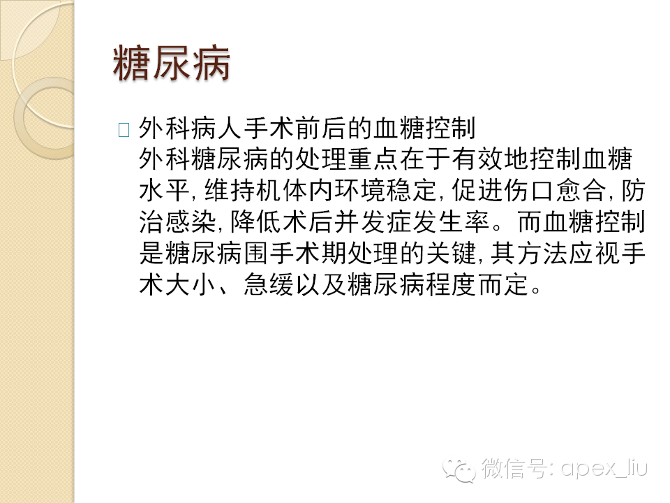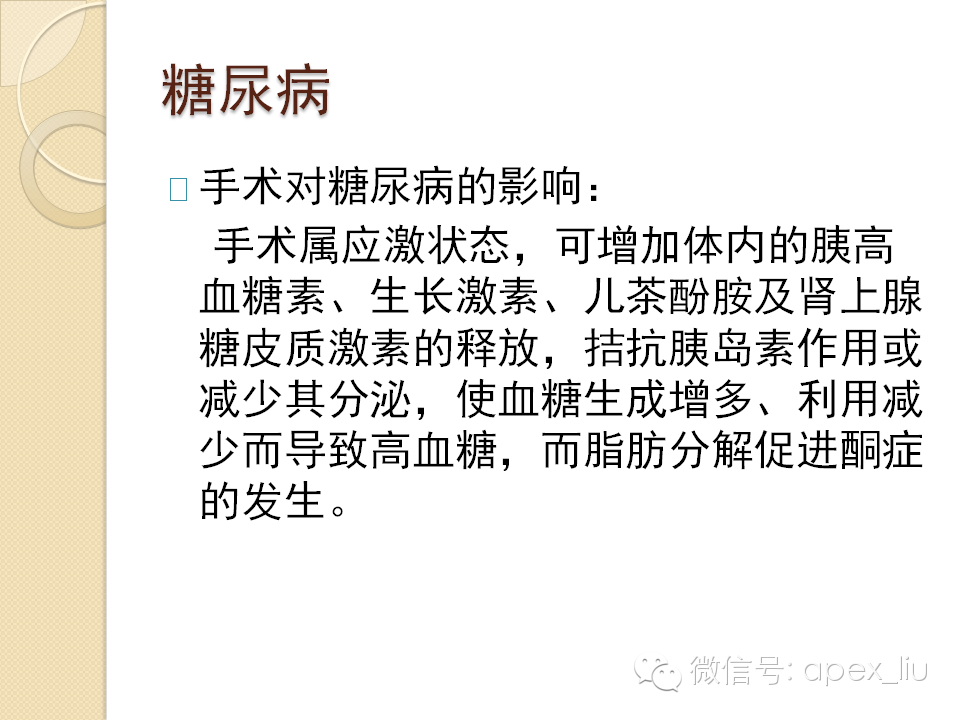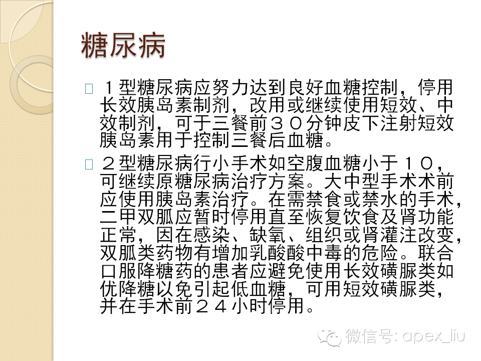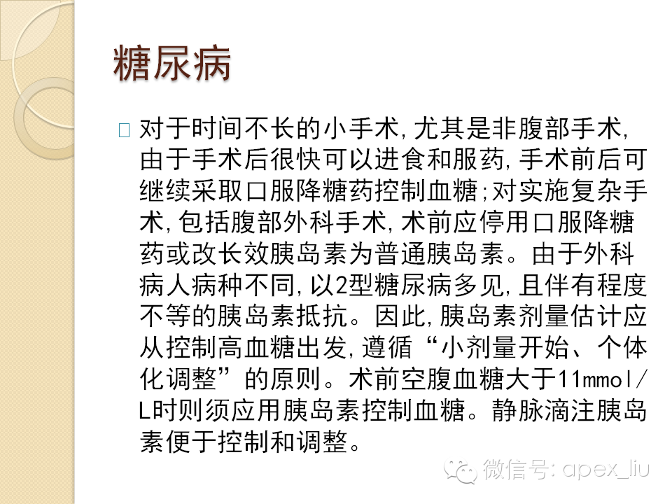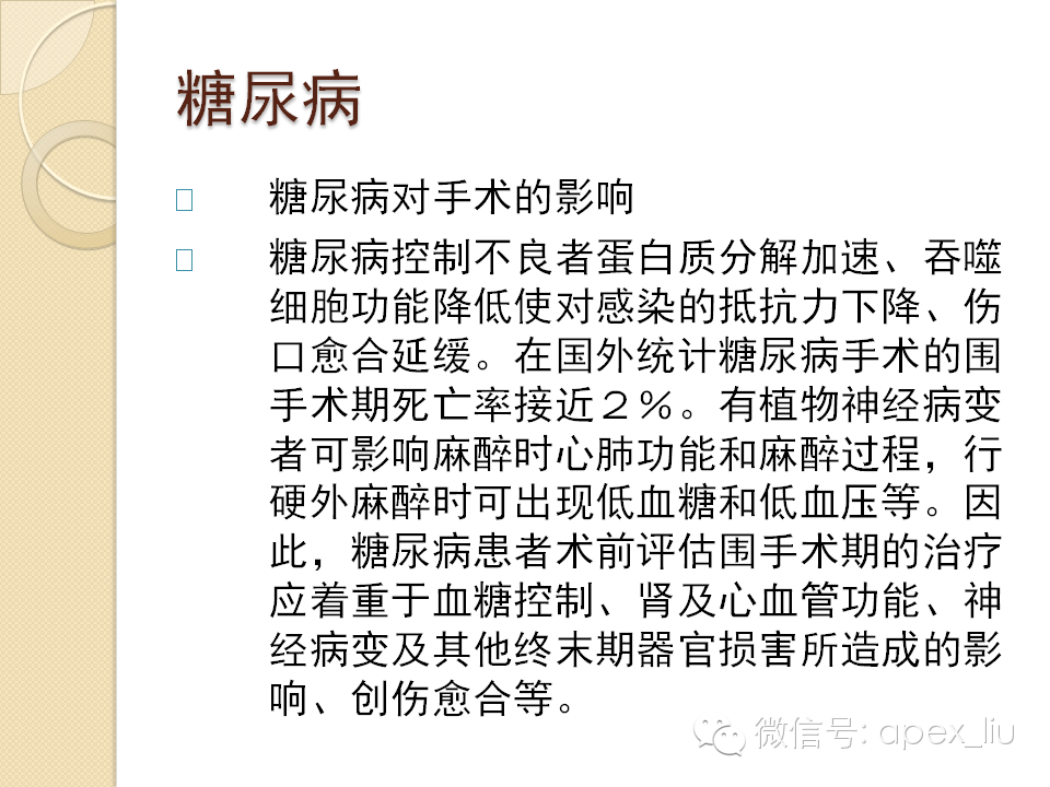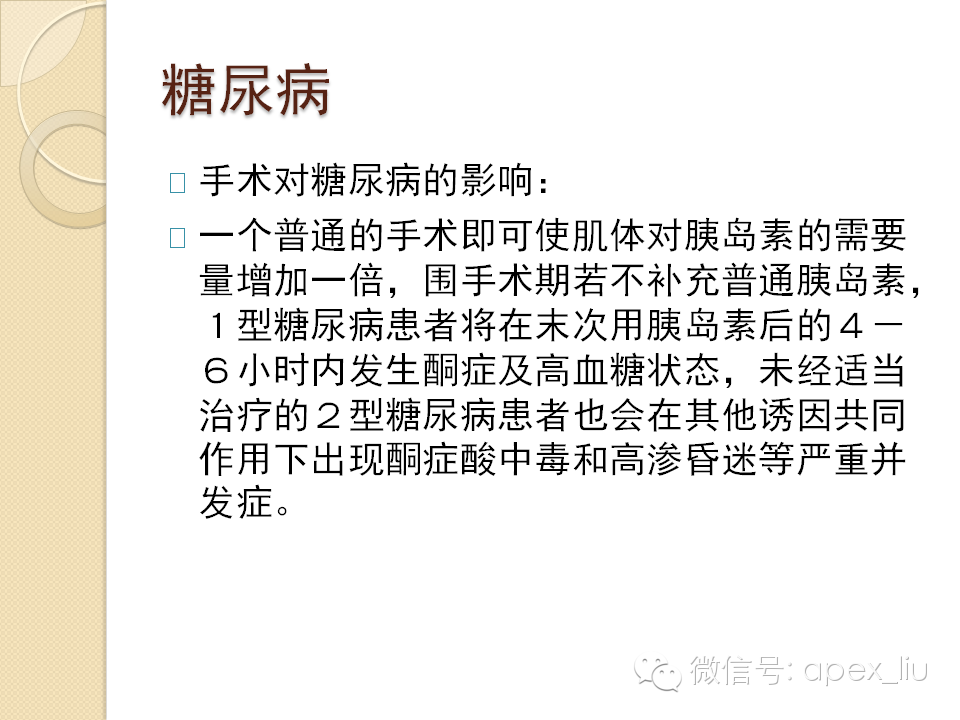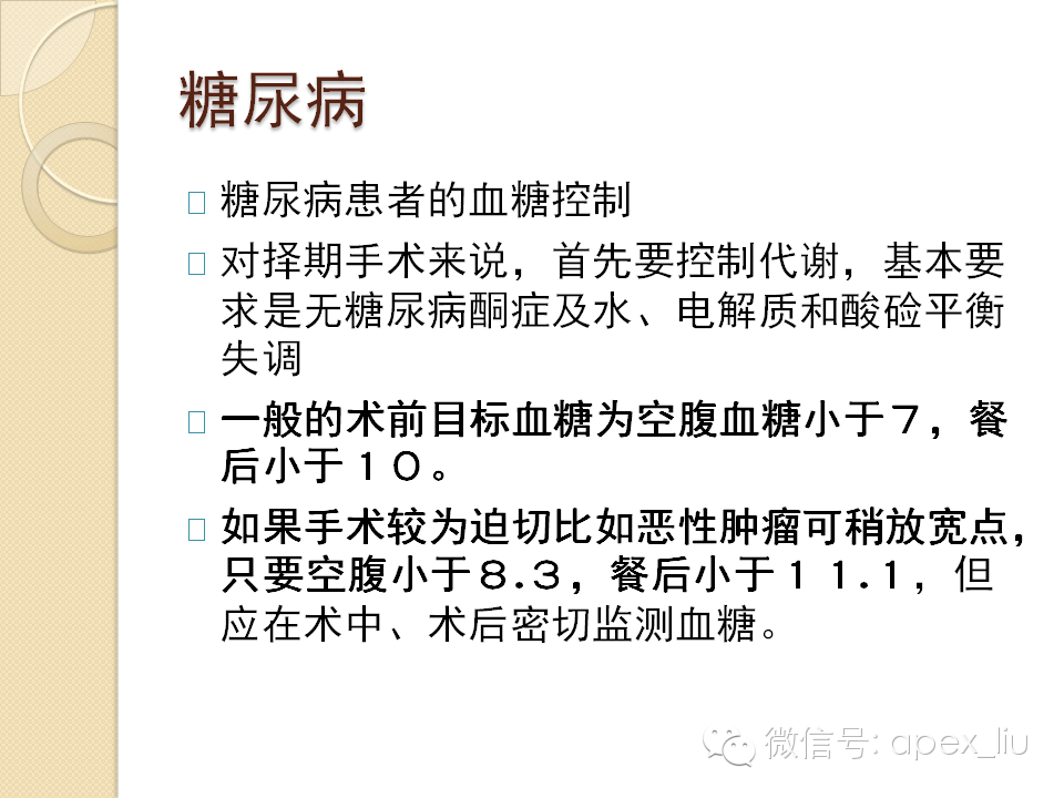 当然上述的血糖指标也只是相对的,估计各位专家可能都在指标以上做过手术。目前还有一项比较实用的指标糖化血红蛋白HbA1C 为标准,术前HbA1C <8.5﹪,糖化血红蛋白反应的是从检验时间开始往前3个月的平均水平,一般三个月检查一次。如果是严格一点的应该HbA1C <7.0﹪。在这我要再次强调各位应该对糖尿病的病程有充分的认识,病史越长的糖尿病患者,发生危险的可能性越大。大约是2000年左右,我院眼科发生一例白内障患者呼吸心跳骤停的情况,患者30年糖尿病,冠心病,高血压,但术前各项指标基本控制在可接受的范围,手术进行到植入人工晶状体的步骤,患者突然意识丧失,呼吸心跳骤停幸亏我院麻醉科主任,也是天津市麻醉科主委李主任,连续20个小时的不间断抢救与复苏,患者终于恢复了呼吸心跳,但仍然留下了肢体残疾。上述病例提醒我们对于长病程的糖尿病患者,如果合并有冠心病,高血压应该高度警惕,手术应该慎重选择。