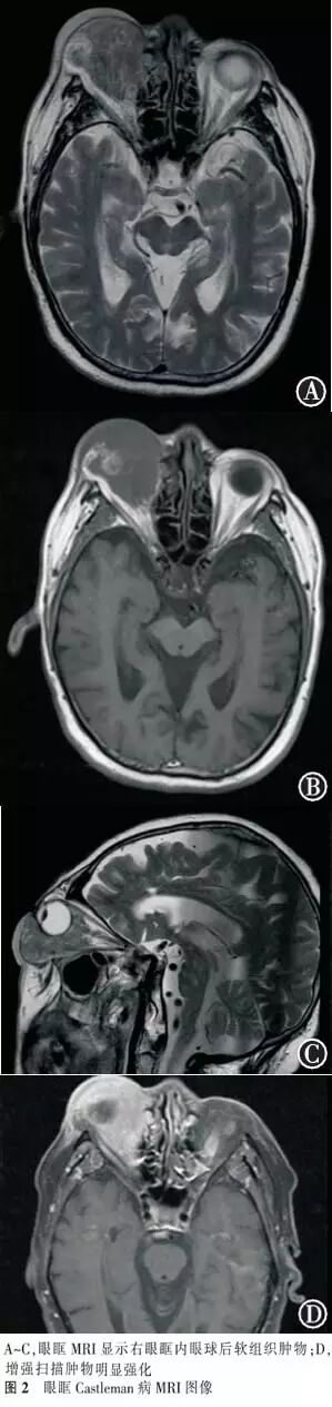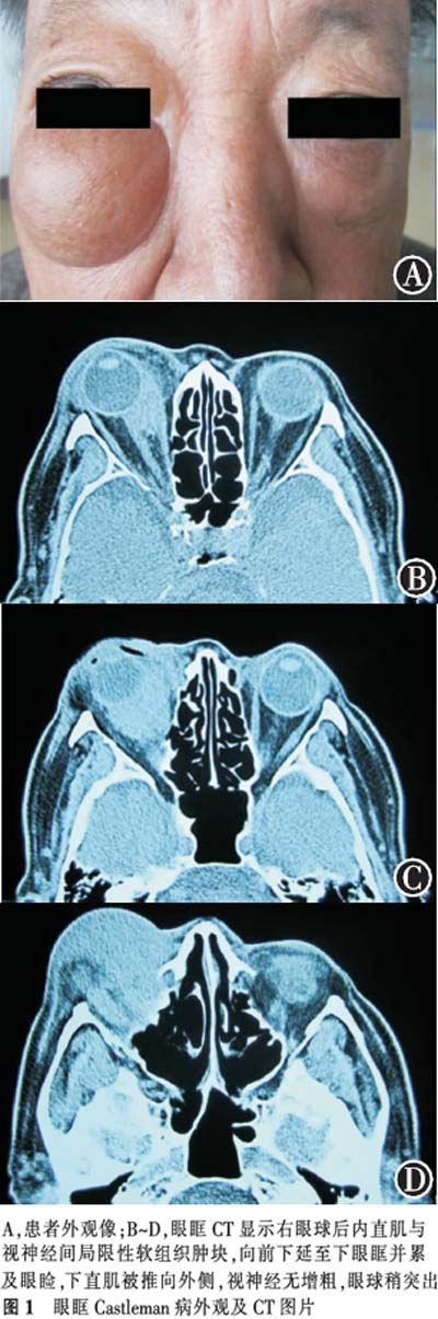 患者,男,77岁,农民,因右眼下睑肿物3年,明显增大3个月而入院。患者于3年前无意中发现右眼下睑肿物,大小1.5 cm×2.0 cm,质软,无红肿、疼痛,不伴有复视、流泪、视力下降等眼部不适,曾就诊于当地县医院,诊断不详,给予激素等药物治疗后肿物变小。1年前发现肿块又稍增大,近3个月明显增大,同时伴眼部红肿、流泪等症状,遂转诊至我院。既往史:高血压病史10余年,糖尿病史1年,1年前患脑血栓。眼部检查:右眼视力 0.3,左眼视力0.5,右眼球稍突出,内转、上转稍受限,右眼下睑可见4.5 cm×3.5 cm类圆形肿物,边界尚清,质软,不活动,结膜充血,角膜清亮,前房深度正常,瞳孔正常大小,对光反应存在,晶状体稍混浊。眼底检查示:视乳头边界清,色可,视网膜血管走形正常,无出血和渗出,黄斑中心反光可见。左眼底未见明显异常。眼位检查:右眼外斜15°。双眼眼压17.30 mmHg。眼球突出度:右眼18 mm,左眼16 mm,眶距112 mm。辅助检查:眼眶CT扫描示右眼眶球后内直肌与视神经间局限性软组织肿块,向前下延至下眼眶并累及眼睑,下直肌被推向外侧,视神经无增粗,眼球稍突出(见图1)。胸腹部CT扫描未见明显异常。眼眶MRI显示右眼眶内眼球后下方可见一等T1等T2信号影,其内信号不均匀,压脂序列呈高信号,病变向眶外突出,与筛窦和视神经分界不清,内、下直肌显示不清,眼环完整,眼球向上、前、外移位,视神经无增粗;增强扫描肿物明显强化(见图2)。