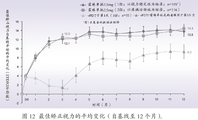 研究结果显示, 1 组和2 组在接受雷珠单抗治疗后,平均BCVA的变化要优于3组(1 组:+10.5;2组:+10.6;3组: +2.2;P <0.01)。从第1个月至第6个月的平均BCVA变化结果来看,由疾病活动性来作为指导雷珠单抗治疗的标准并不劣于以视力稳定性为标准(2组 vs 1组:+11.7 vs 11.9;P <0.01)。平均BCVA自基线至12个月的变化量分别为+13.9(1组)、+14.4 (2组)、+9.3(3组)。在12个月有63.8%~65.7%的患者显示近视性CNV渗漏的缓解,12个月内患者接受雷珠单抗治疗的次数中位数分别为4.0(1组)和2.0 (2组)。整个试验过程未发现有死亡或眼内炎及心肌梗死的报告。