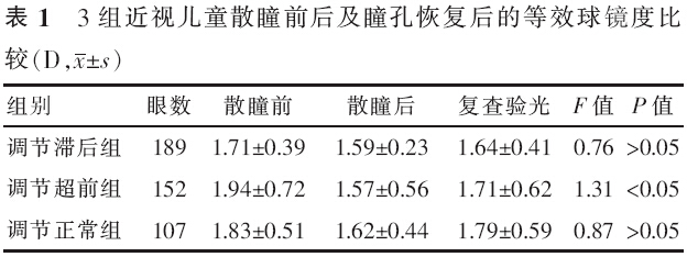 【摘要】 目的 观察分析10~15岁调节功能正常、超前、滞后的近视儿童显然验光与1%阿托品眼用凝胶散瞳验光结果的一致性,以指导儿童近视的验光配镜工作。方法 前瞻性研究。等距随机抽样2013年7-8月间来唐山医院视光学诊疗中心就诊的近视患者224例(448眼),按调节功能分为正常(107眼)、超前(152眼)及滞后(189眼) 3组,各自对比散瞳前显然验光、散瞳验光及瞳孔恢复后复查验光屈光度的变化。采用方差分析进行数据检验。结果 调节功能正常组和滞后组3次验光所测得结果差异无统计学意义(F=0.87、0.76,P>0.05);调节超前组3次验光所得结果差异有统计学意义(F=1.31,P<0.05)。结论 10~15岁近视儿童验光配镜时,调节功能滞后和正常患者综合验光仪显然验光结果可直接用于指导配镜,对于调节超前的患者,需要以阿托品散瞳验光结果为依据。