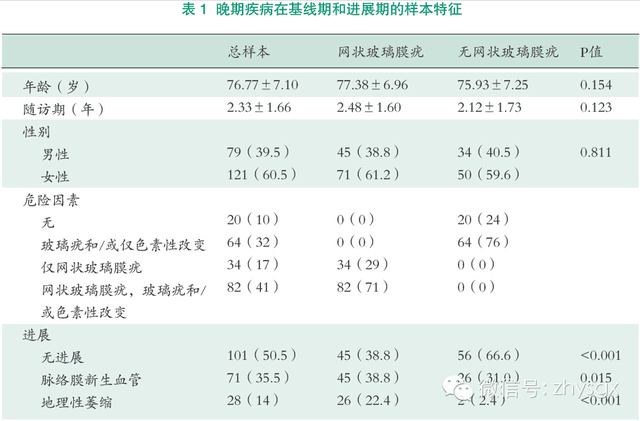 研究结果显示,200例受试者平均年龄为77±7岁,其中61%为女性。116例(58%)对侧眼眼底有网状玻璃膜疣,136 例(68%)有超过125μm的玻璃疣,72例(36%)有色素性改变,20例(10%)同时有125μm 以上的玻璃疣和色素性改变, 34例(17%)仅有网状玻璃膜疣。平均随访2.3年后,36%患者对侧眼发展为脉络膜新生血管,14%发展为地理状萎缩。对侧眼有网状玻璃膜疣经常发展为晚期AMD(61% vs 33.4%,P <0.001)和地理状萎缩(22.4% vs 2.4%,P <0.001)。网状玻璃膜疣是发展为地理性萎缩的独立危险因素(HR 4.93, P =0.042),但不是脉络膜新生血管的危险因素,至少在本次研究的随访期间。在基线期就存在玻璃疣超过125μm和色素性改变是发展为脉络膜新生血管和地理性萎缩的显著危险因素(HR 1.96~11.73, P ≤0.020)。