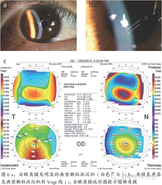 患者,男,29岁,确诊患有圆锥角膜及GCD,配戴RGP 矫正屈光不正。患者母亲有角膜营养不良病史,最佳矫正视力OD:-1.25/-3.50*38=20/50, OS:-1.00/-3.00*176=20/30。裂隙灯检查示双眼中央区角膜见散在分布的,边界清楚的灰白色的角膜基质混浊(见图6a,箭头)。角膜地形图呈典型的圆锥角膜表现:屈光力图示下方角膜变陡,高度图示高度差值超过50µm,I-S值超过1.2,平坦K与陡峭K差值大于1.5D (见图6c)。右眼中央角膜厚度(CCT)为495µm,左眼CCT 为504µm;右眼最薄角膜厚度(TCT)为475µm,左眼TCT为491µm。