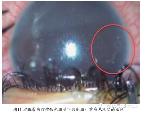 患者,女,14岁,右眼眼红1个月。右眼远视力20/40,近视力20/30。裂隙灯发现右眼前房有一条活动的蠕虫(见图12),房水闪辉(+),前房细胞(+),眼后段检查未发现炎症表现及蠕虫,患者之前未接受任何治疗。血常规示白细胞计数11500个/ml,白细胞分类计数未显示嗜酸性粒细胞增多,ERS为35mm/h,丝虫循环抗原检测呈阴性,未发现丝虫感染累及全身的表现。