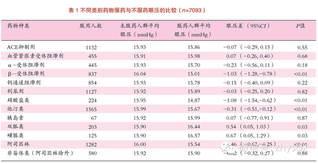 结果显示7093名受试者中,服用β-受体阻滞剂类药物(P<0.01)、硝酸盐类药物(P<0.01)、他汀类药物(P<0.01)和阿司匹林(P<0.01)的受试者眼压的平均值,比未服用以上各类药物者显著降低。
