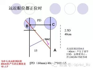 三角形ABC中,BC=瞳距(PD) 。角∠BAC代表的就是从远距到近距40cm处产生的会聚度,换算成棱镜度就是 BC/AC 即PD(60mm)/40cm]*100=15 △