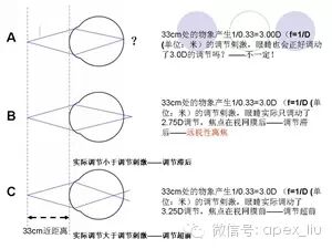 所以,当我们调节反应的正常值是+0.25D时,欠矫正-0.5D时的“正常值”就会变为“-0.25D”了。