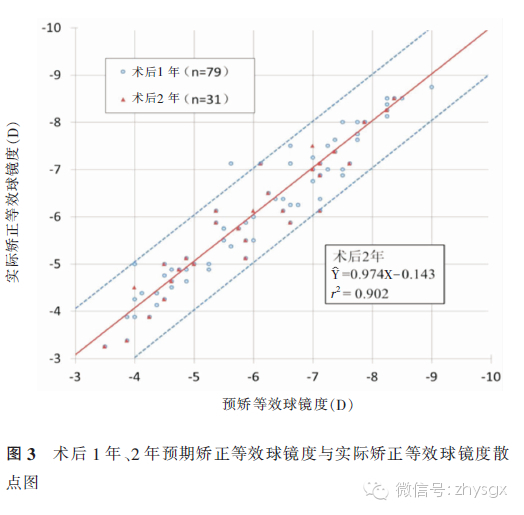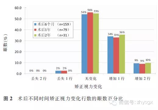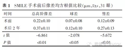 【摘要】 目的 探讨SMILE矫正近视的安全性、有效性、可预测性及稳定性等。方法 前瞻性研究。符合屈光手术常规适应证的94例(170眼)近视患者入选,行常规SMILE手术。患者年龄为18~44岁,平均(26.8±4.7)岁,术前等效球镜度(SE)-3.25~-9.13 D,平均(-6.20±1.37)D,散光0.00~-3.25 D,中位数-0.75(0.75)D,角膜厚度484~600 μm,平均(554.7±27.5)μm。常规检查包括UCVA、BCVA、屈光度、眼压及角膜地形图、像差、裂隙灯显微镜检查等。术后随访6~24个月。采用配对t检验、线性回归分析进行统计分析。结果 所有病例手术顺利。术后2年UCVA≥1.0、≥0.8的眼数分别为97%、100%。100%的术眼BCVA达到或高于术前BCVA,35%BCVA提高1行,10%BCVA提高2行。术后SE为(-0.01±0.45)D,87%术眼SE在±0.50 D以内,100%术眼SE在±1.00 D以内。术后总高阶像差、球差、彗差均方根值与术前比较均增加(t=-6.861、-2.078、-5.672,P<0.05),分别增加(0.15±0.12)μm、(0.04±0.11)μm、(0.14±0.14)μm。结论 SMILE矫正近视临床效果肯定,具有较好的有效性、安全性、可预测性及稳定性;术后高阶像差、球差、彗差均增加,球差增加较少。