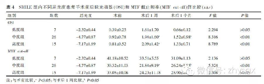 【Abstract】 Objective To investigate the influence of FS-SBK, SBK, and SMILE refractive surgeries on visual quality by analyzing variations in the glare index and the visual quality parameters of distinct refractive errors. Methods In this prosective cases control study, 122 patients, who underwent SBK, FS-SBK or SMILE surgery, were enrolled from August to October 2013 and divided into high, moderate and low myopia groups. The glare index (opposite sector index, OSI) and modulation transfer function cut-off (MTF cut-off) were measured with a OQAS visual quality analyzing system preoperatively and one day, one week and one month postoperatively. Additional measurements were made to evaluate the differences among the three surgical methods. Results The effects on postoperative visual quality due to the different surgical procedures were as follows: ①Vision: visual acuity improved after all surgeries and there were no significant differences among the results. ②OSI: there was no statistically significant difference between SBK and FS-SBK. When compared with pre-operative OSI, there was a statistically significant difference between moderate and high myopia groups one week after SMILE surgery. ③MTF cut-off: there were no statistically significant differences before and after surgery in the FS-SBK group, but there was a statistically significant difference from both SBK and SMILE surgeries in the moderate myopia group 1 week postoperatively compared with the preoperative period and 1 month postoperatively. However, there were no significant differences for the remaining time points. No significant differences were found between the different myopia groups. Conclusion Postoperative visual quality improves after the three surgical procedures discussed above. Due to a raised OSI after SMILE surgery, LASIK is the better option for high and moderate degrees of myopia. While the MTF cut-off did not vary significantly between pre- and postoperative FS-SBK, it decreased one week later after SBK and SMILE surgeries but recovered after one month in the moderate myopia group, even reverting to pre-operative levels.