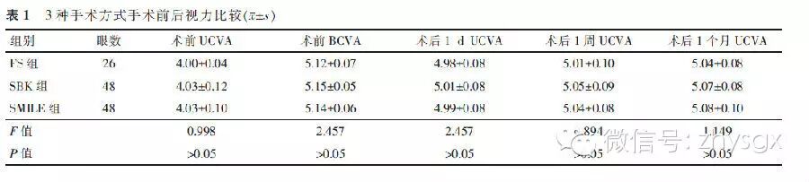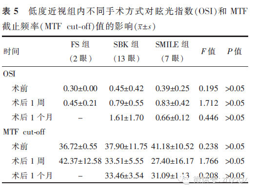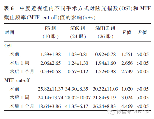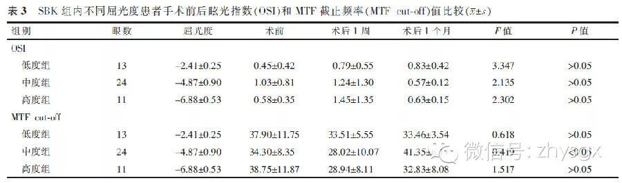【摘要】 目的 分析飞秒制瓣SBK(FS-SBK)、SBK和SMILE 3种术式矫正近视后的眩光指数和视觉质量参数的变化,评估3种手术在不同屈光度范围内对视觉质量的影响。方法 前瞻性病例对照研究。收集2013年8-10月行近视矫正手术的122例(122眼),根据患者选择的手术方式分别行FS-SBK(26例)、SBK(48例)和SMILE(48例)手术,并根据屈光度分为高、中、低度近视组。使用OQAS视觉质量分析系统、采集手术前和术后1 d、1周、1个月时复查的眩光指数(OSI)和调制传递函数截止频率(MTF cut-off),采用方差分析评价在不同屈光度组施行不同手术方式对OSI和MTF cut-off值变化的影响。结果 手术方式对术后视觉质量的影响:①视力:术后视力较术前明显提高,3种手术在各时间点组间比较差异均无统计学意义。②OSI值:SBK和FS-SBK组手术前后差异均无统计学意义。SMILE低度组术后OSI与术前比较,差异无统计学意义,中、高度组术后OSI升高,术后与术前比较,差异有统计学意义(F=8.316、8.789,P<0.01)。③MTF cut-off值:FS-SBK组手术前后差异无统计学意义。SBK组和SMILE组中度近视术后1周与术前、术后1个月差异有统计学意义(F=4.469,P<0.05)。屈光度对术后视觉质量的影响:高、中、低度近视组内,术前和术后各时间点3种手术方式之间差异无统计学意义。结论 3种屈光手术术后视力明显提高,术式对术后视力影响不显著。中、高度近视SMILE术后眩光指数升高,因此准分子激光切削对减少眩光比SMILE有优势。视觉质量参数MTF cut-off在FS-SBK手术前后变化不显著,而SBK和SMILE术后较术前有下降,在1周时明显,到1个月时上升,且基本接近术前水平,这种优势在中度近视较突出。