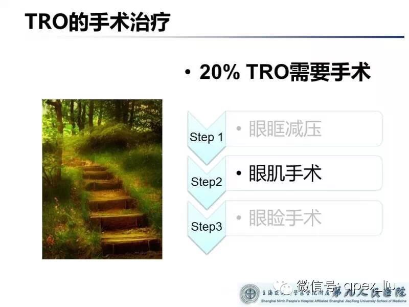 20% 的TRO需要手术治疗,手术次序依次是眼眶减压、眼肌手术和眼睑手术。每位患者的手术方案需要根据其临床表现、体征来个性化设计,表现出多样化的特点。