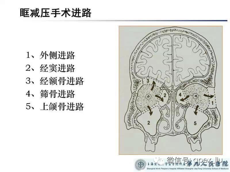 眼眶减压手术进路主要有5种。手术方式包括一壁减压、二壁减压、三壁减压、四壁减压。