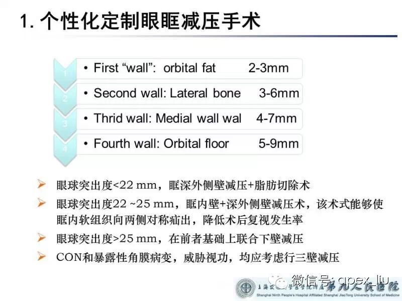 眼眶减压手术已经进入了个性化设计的时代。优先选择的减压顺序是:眶脂、外侧壁、内侧壁、眶底。参考患者眼球突出度等指标,个性化定制手术方案。