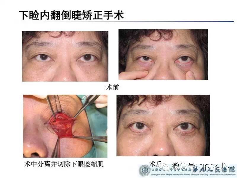 这位患者眼球突出、下睑退缩、下睑内翻倒睫。由于她暂时不接受眼眶减压手术,我们为她进行了下睑缩肌切除、下睑内翻倒睫矫正手术,术后内翻倒睫完全矫正。但是由于眼球突出,术后仍然存在眼睑退缩。